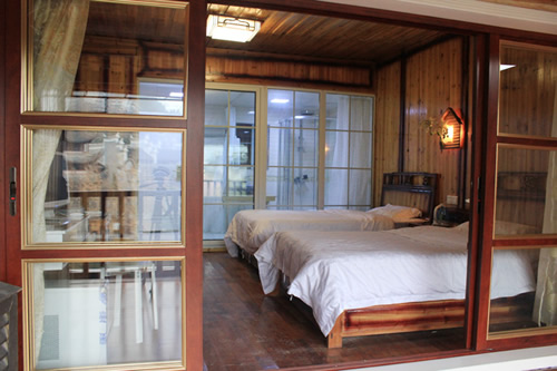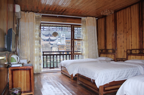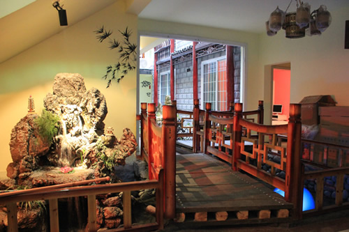 古樸的客房內(nèi),超大陽臺全景落地窗,是您欣賞沱江風光帶首選客棧,兩座百年四合院內(nèi)小橋流水,假山錦鯉,一百三十平米休閑花園別具情調(diào)。紅酒加咖啡的大堂吧、彩色精致的情調(diào)房、古典高雅的臨江觀景房以及大型公共觀景平臺,龍閣的點點滴滴都透著出古城的神韻和幽靜,走進龍閣客棧,給您一個完美的鳳凰古城沱江全景!