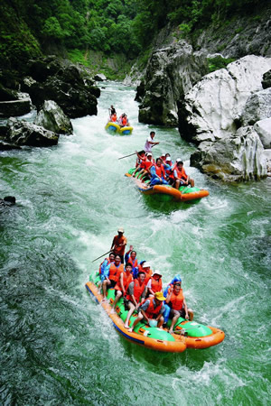 猛洞河水量豐富,河流坡降大,水急灘多浪奇,高大的峭壁直插水面,兩岸并相靠攏,形成幽深的峽谷景觀。沿河兩岸古木蒼天,蒼翠欲滴,奇石錯(cuò)落,流泉飛瀑隨處可見,下游一路水碧山青,風(fēng)光秀麗,野猴成群,溶洞奇特。猛洞河天下第一漂項(xiàng)目位于猛洞河支流,全長47公里,最精彩處位于哈妮宮至牛路河段,長約17公里。該景區(qū)兩岸多為原始次森林,蔥蔥郁郁,水流湍急,碧綠清亮,有十里絕壁,十里瀑泉,十里畫卷,十里洞天的美譽(yù)。其中有急流險(xiǎn)灘108處,大小瀑布20處。漂流,穿急流,越險(xiǎn)灘,闖狹谷,捕激浪,有驚無險(xiǎn),回味無窮。特別是哈妮宮、三角巖、雞籠門、遇仙峽(捏土)、閻王灘、落水坑、夢思峽、鯉魚剖肚、三大炮等景點(diǎn),無不令人叫絕觀止。