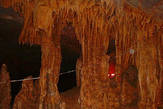 | 藏君洞為一大型天然溶洞,溶洞長(zhǎng)25000米,已探明洞長(zhǎng)4000m,洞內(nèi)洞中有洞、洞中有河,迂回曲折,地下河流水潺潺,溶洞分布在石炭系中、上統(tǒng)碳酸鹽巖中,洞內(nèi)鐘乳石十分豐富:石筍、石柱、石幔、石樓、石像比比皆是。洞內(nèi)構(gòu)造奇特,石鐘乳千姿百態(tài)、絢麗多彩,景觀奇秀,珍品奇絕,是我國(guó)少有的大型碳酸鹽巖巖溶洞穴之一。目前已開(kāi)發(fā)的4000m洞穴中,由十二個(gè)大的溶洞群構(gòu)成,由洞口往里有護(hù)君堂、惠帝殿、兩重天、南巡廳、不夜城、龍鳳宮、北國(guó)廳、江南廳、江河壩、閱兵場(chǎng)、國(guó)寶廳等溶洞景觀區(qū)。溶洞一般高5~30m,長(zhǎng)60~100m,寬10~20m,面積60~200㎡。十二個(gè)溶洞沿地下河呈串球狀分布,洞與洞之間有巷道(地下河管道)相連,溶洞中景觀十分豐富,仿佛是一個(gè)瑰麗的地下宮殿。如護(hù)君堂內(nèi)有“尚書(shū)帽”、“御馬”、“貓頭鷹”、“小羊羔”、“老夫妻”、“天宮浴盆”等景點(diǎn),惠帝殿內(nèi)由“斷劍石”、“龍椅”、“觀音立佛”、“觀音蓮花寶座”等,“蔬果長(zhǎng)廊”中有形似花菜、白菜、絲瓜、茄子、黃瓜等石筍,不夜城內(nèi)有乳白色石鐘乳巖溶坡面,龍鳳宮內(nèi)有石幔、石柱琳瑯滿目及鐘乳石構(gòu)成的似漢白玉“龍鳳石床”、“旭日東升”的浮雕石鐘乳墻、“燈籠群”、“攀龍柱”、“石蓮花”等,國(guó)寶廳巨型石柱等,巷道側(cè)壁唐僧師徒“西天取經(jīng)”壁畫(huà)等,景觀類型齊全,是巖溶洞穴中具有典型地學(xué)意義的巖溶地貌景觀,屬國(guó)家級(jí)的地質(zhì)遺跡景觀。