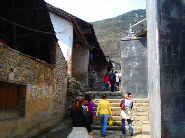 苦竹寨 賀龍?jiān)谏V哺锩鼤r(shí)期,幾乎踏遍了澧水兩岸的山山水水,村村寨寨。苦竹寨是澧水邊的一座少數(shù)民族雜居的村落,保留了明清時(shí)的建筑特色,民風(fēng)淳樸,村民能歌善舞,許多桑植民歌都是靠苦竹寨的歌手流傳的。入夜的時(shí)候,苦竹寨亮起了盞盞紅燈,這是村里的一個(gè)傳統(tǒng)。當(dāng)年紅軍夜行軍過苦竹寨的時(shí)候,村里有個(gè)老婆婆怕紅軍夜黑路難走,便在家門口懸起了一盞紅燈,其它村民爭相效仿,苦竹寨成了一個(gè)燈的世界。這段軍民魚水情被寫成了歌,傳唱到現(xiàn)在,這就是《門前掛盞燈》。