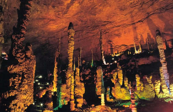 黃龍洞圖片 黃龍洞以立體的洞穴結(jié)構(gòu),龐大的洞穴空間,寬闊的龍宮廳及數(shù)以萬計(jì)的石筍,高大的洞穴瀑布,水陸兼?zhèn)涞挠斡[線等優(yōu)勢(shì)構(gòu)成了國內(nèi)外頗有特色的游覽洞穴,洞內(nèi)有1庫、2河、3潭、4瀑、13大廳、98廊,以及幾十座山峰,上千個(gè)白玉池和近萬根石筍。由石灰質(zhì)溶液凝結(jié)而成的石鐘乳、石筍、石柱、石花、石幔、石枝、石管、石珍珠、石珊瑚等遍布其中,無所不奇,無奇不有,仿佛一座神奇的地下“魔宮”。黃龍洞現(xiàn)已開放有龍舞廳、響水河、天仙瀑、天柱街、龍宮等6大游覽區(qū),主要景觀有定海神針、萬年雪松、龍王寶座、火箭升空、花果山、天仙瀑布、海螺吹天、雙門迎賓、滄海桑田、黃土高坡等100多個(gè)。