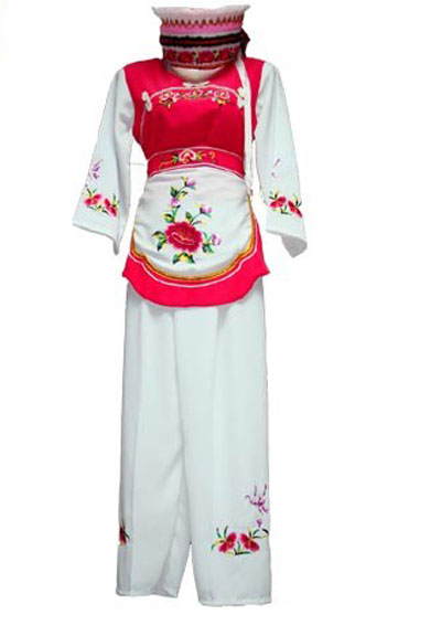 “崇尚白色”是白族人的一個(gè)明顯特點(diǎn)。不論男女都愛穿白色服飾,故有“要得俏,一身孝”之說,過去穿戴的白布又稱“家布機(jī)”,是白族人自己種棉花,自己紡紗,自己用土機(jī)織,用土法洗漂而成,其服飾美觀大方。一般來說,男子戴五尺、七或九尺的白布頭巾。上穿白色對(duì)襟布扣汗衣,外套青色滿肩馬褂,腰系桃花兜,并配撤穗荷包,下著青色寬腳褲,腳穿白布襪子和天官云頭鞋。婦女頭上蒙白色繡花帕,兩耳垂環(huán),手戴鐲子或戒指,外套繡花圍裙,用繡花飄帶系著,右上胸佩掛三吊或五吊銀質(zhì)牙簽。下著蘭色寬褲,腳纏白色裹腳布,穿繡花尖尖鞋。無婚女性則挽“簪巴”,挽于腦后的稱“粑粑”,挽于頭頂?shù)姆Q高把簪,簪上套有網(wǎng),橫插簪子;兒童衣服多繡花,外圍肚兜,頭戴虎頭鼓針菩薩帽,頸戴“項(xiàng)圈”、“百家鎖”等,手腕套有銀圈,上系小吊,吊上有錘、鈴、鞋、斧、簽等。