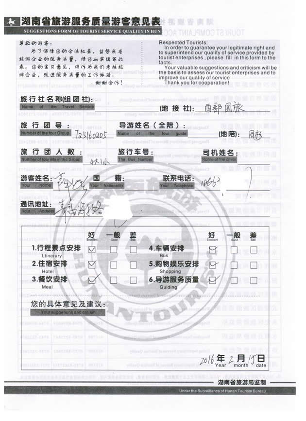 2月份,青島薛女士一行5位貴賓與湖南西部(張家界)中國國際旅行社工作人員——向翅取得聯(lián)系,經(jīng)過商談,雙方達成協(xié)議并簽訂旅游合同,于2月11日抵達張家界,開始張家界之旅。此次行程是由我社優(yōu)秀導(dǎo)游——田杉負責(zé)旅游接待工作,田杉在旅游過程中講解詳細,客人也很滿意。同時也感謝薛女士一行貴賓選擇湖南西部(張家界)中國國際旅行社,以及您對湖南西部國旅的信任與支持。我們會繼續(xù)努力,做好旅游接待工作。期待下一次與您的合作,祝您愉快!